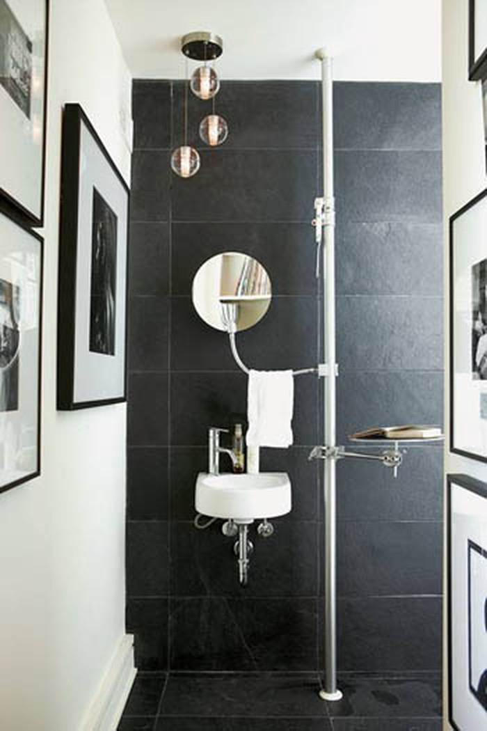 Đầu tiên phải nói đến là ngôi nhà đầy tính nghệ thuật của Tiến sĩ Kenneth Montague, Toronto, Mỹ với phòng tắm thiết kế theo phương thẳng đứng sử dụng thanh inox làm điểm tựa kết nối các vật dụng cá nhân như gương, dây treo khăn, giá đỡ sách và sẽ là thiếu xót nếu bỏ qua bức tường đen cùng tông màu sàn nhà ốp bằng đá granite.