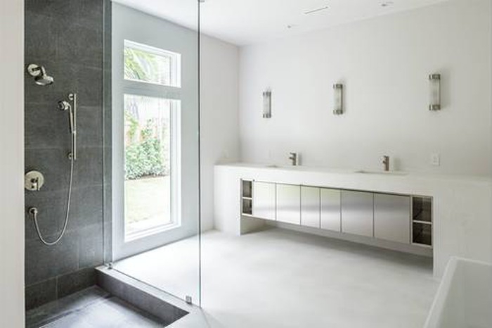 Cũng là một ngôi nhà tại Florida minh chứng cho việc sử dụng đá granite tại bồn tắm đứng được thiết kế lõm hơn so với không gian xung quanh toàn màu trắng đã tạo nên cái nhìn lạ và ấn tượng.