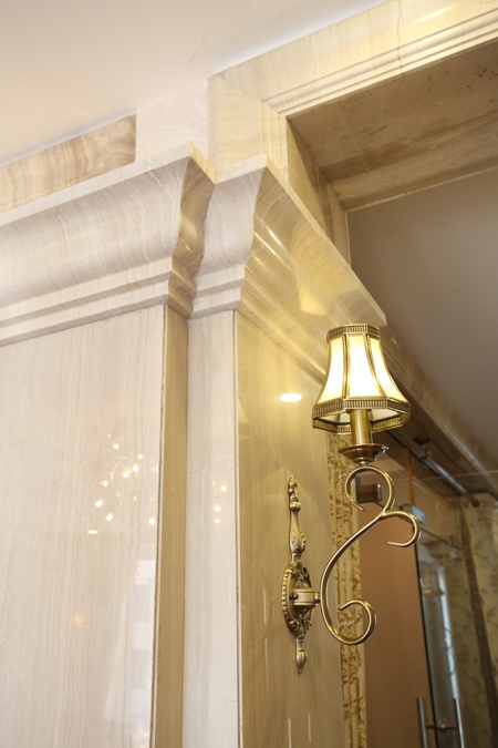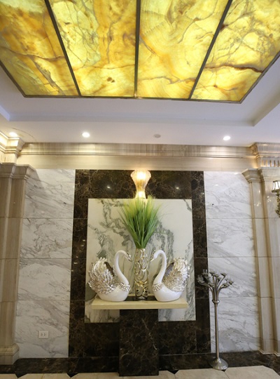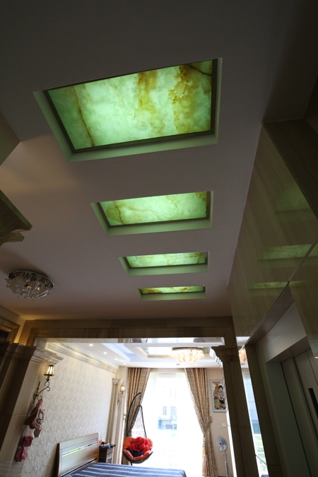 Ngay cả chi tiết lắp ráp các màu đá hoa cương với nhau cũng được gia chủ bàn tính rất kỹ với đơn vị thi công, nhất là tại những vị trí trần làm bằng đá xuyên sáng kết hợp cùng đèn bên trong để chọn được cách thi công tạo “lối thoát” dễ dàng cho việc bảo trì và thay thế hệ thống chiếu sáng về sau.